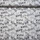 Látka so sivým a čiernym písmom Bavlnená látka bielej farby s čiernym a sivým písmom.