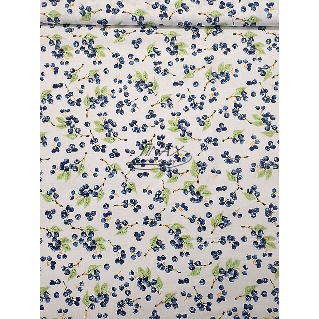 Bavlnená látka bielej farby s modrými čučoriedkami.