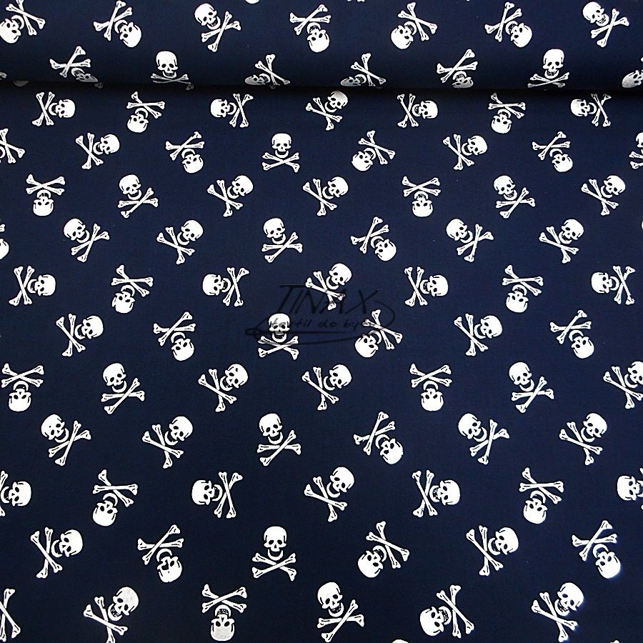 Bavlnená látka čiernej farby s bielymi lebkami.