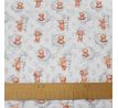 Mäkučká polyesterová látka s pretlačenými guličkami bielej farby s oranžovými macíkmi a sivými obláčikmi.