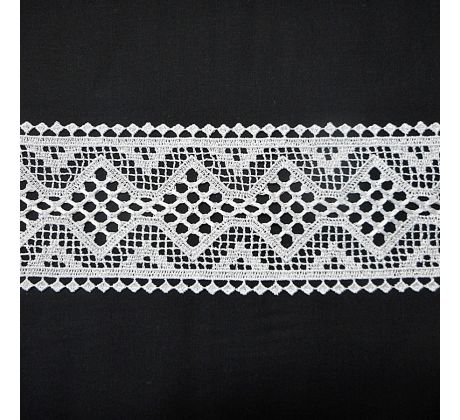 Biela polyesterová krajka, vhodná na obšívanie obrusov a záclon.